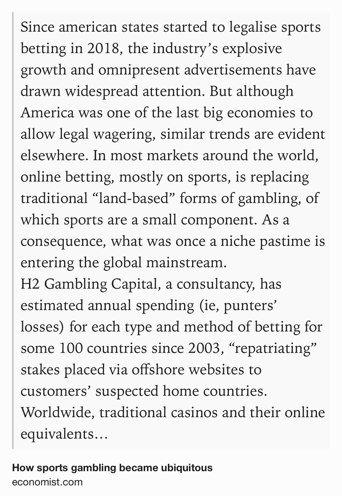 How sports gambling became ubiquitous https://www.economist.com/finance-and-economics/2024/12/05/how-sports-gambling-became-ubiquitous